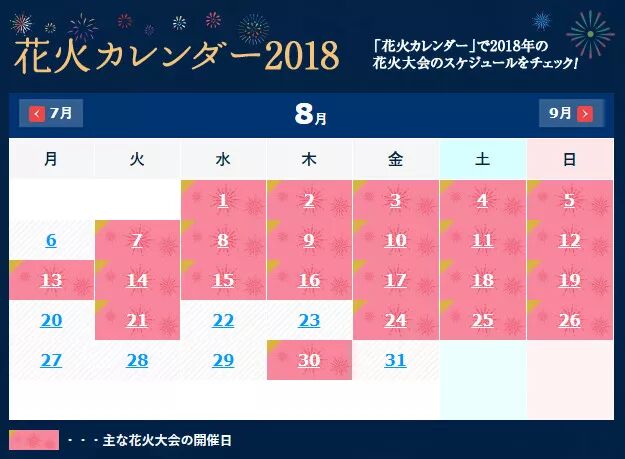 官方网站 Walkerplus 早早发布出全国花火大会举办地点和时间信息。吃下这颗定心丸,先为日本浪漫烟花之旅选定一个出行好日子吧!
