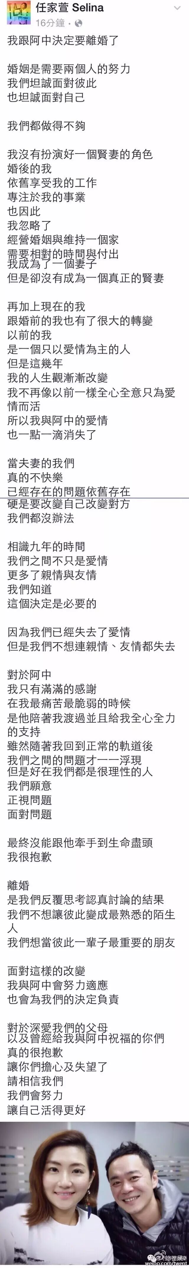 张承中的声明说,他曾习惯于那个追着他跑的Selina。看Selina的声明说,现在的她,比婚前有很大改变,她不再像以前那样全心全意只为爱情而活,所以她和阿中的爱情,也一点一滴消失了。
