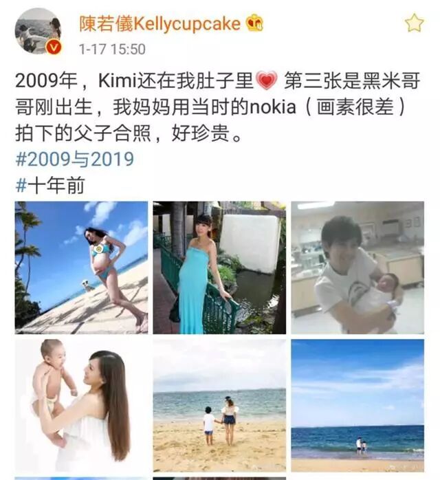 1月17日,陈若仪晒出一组老照片,“2009年,Kimi还在我肚子里,第三张是黑米哥哥刚出生,我妈妈用当时的nokia(画素很差)拍下的父子合照,好珍贵。2009与2019,十年前。”