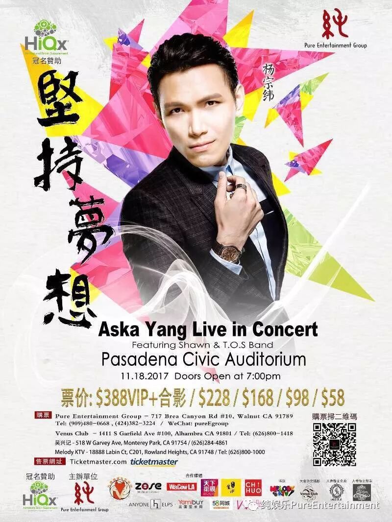 由纯娱乐主办的【坚持·梦想】杨宗纬洛杉矶个人演唱会将于2017年11月18日在Pasadena Civic Auditorium举行。订票热线:909-480-0668;424-382-3224;或扫二维码去购票。