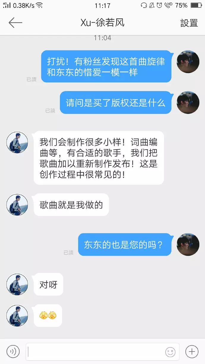 因此,很多人就开始吐槽了说小源这首歌抄袭,并拿这件事大做文章,说王源小小年纪不学好。随后,就有粉丝看不下去了,直接私信询问了作曲者徐若风。
