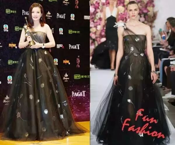 身穿Oscar de la Renta薄纱单肩礼服,仪态万千。