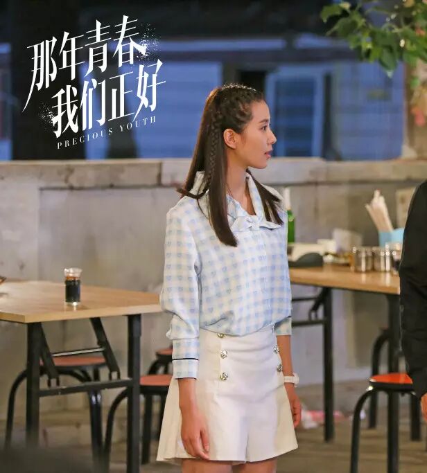 除了校服外,刘诗诗在剧中的服装多以能衬托她清纯学生气质的清爽浅色为主。蓝白色格子衬衫的领子在胸前交叉成蝴蝶结,为衬衫增添了文艺气质。白色高腰双排扣裙裤显腿长,搭配白色手表,让刘诗诗就像夏天里的一颗薄荷糖。