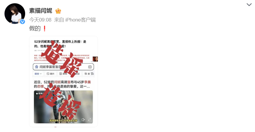 9月20日,闫妮晒出照片辟谣:“假的!”随后,李晨工作室也直接晒照打假:“假!”
