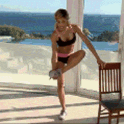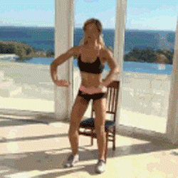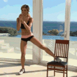 第七个动作:一只脚压在椅子上面,然后双手叉腰做半蹲的动作,做完15下换另外一条腿同样15下为一组,坚持一天5组。