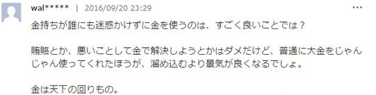 有钱人又没给别人添什么麻烦,花点钱,这难道不是件好事吗?贿赂或者是用钱来做坏事神马的当然是不可以的,但是就这样一个劲地的花钱比起存钱来说不是更能刺激经济发展,改善经济的不景气吗? 金钱是万能的啊!