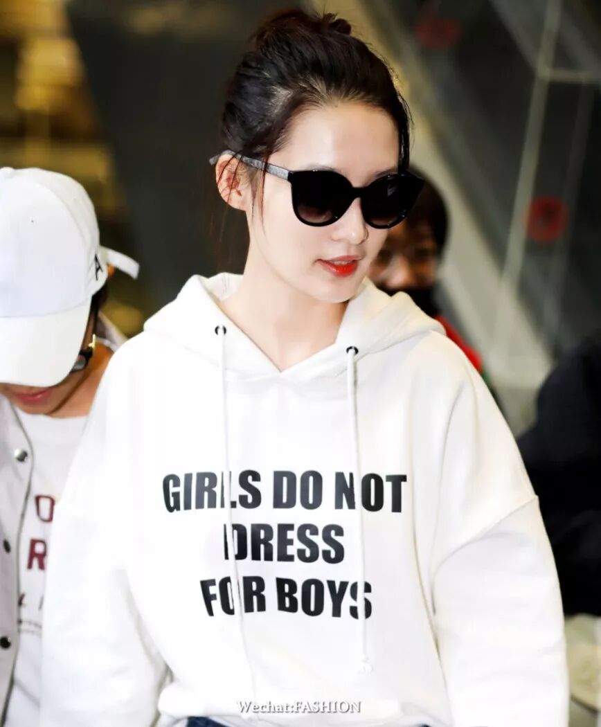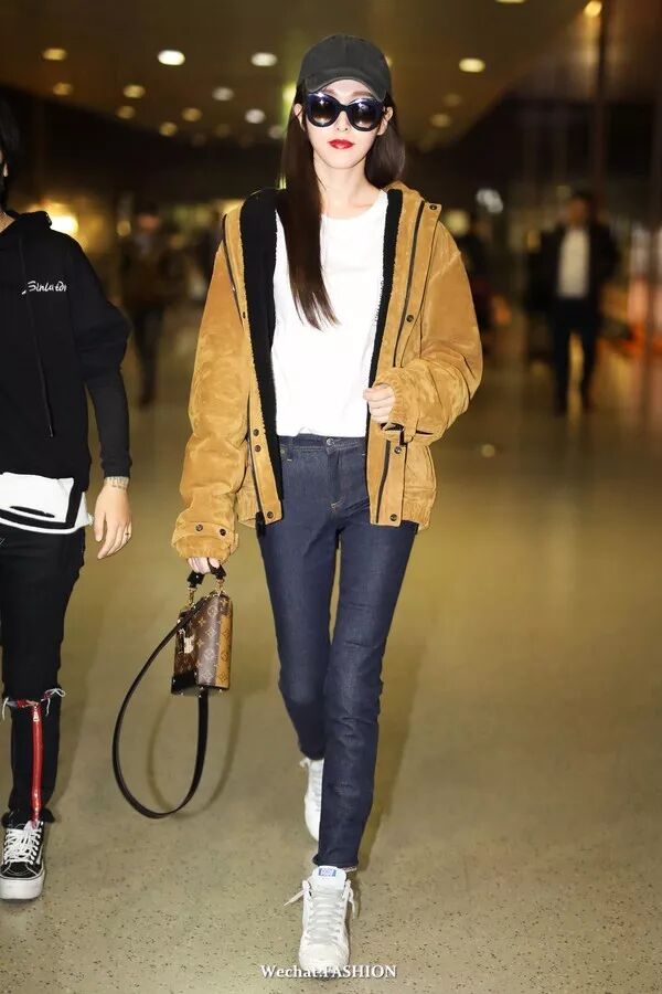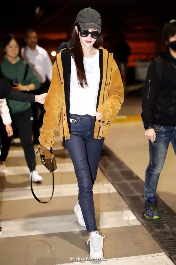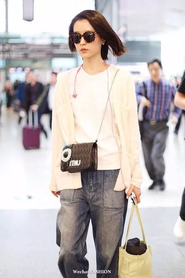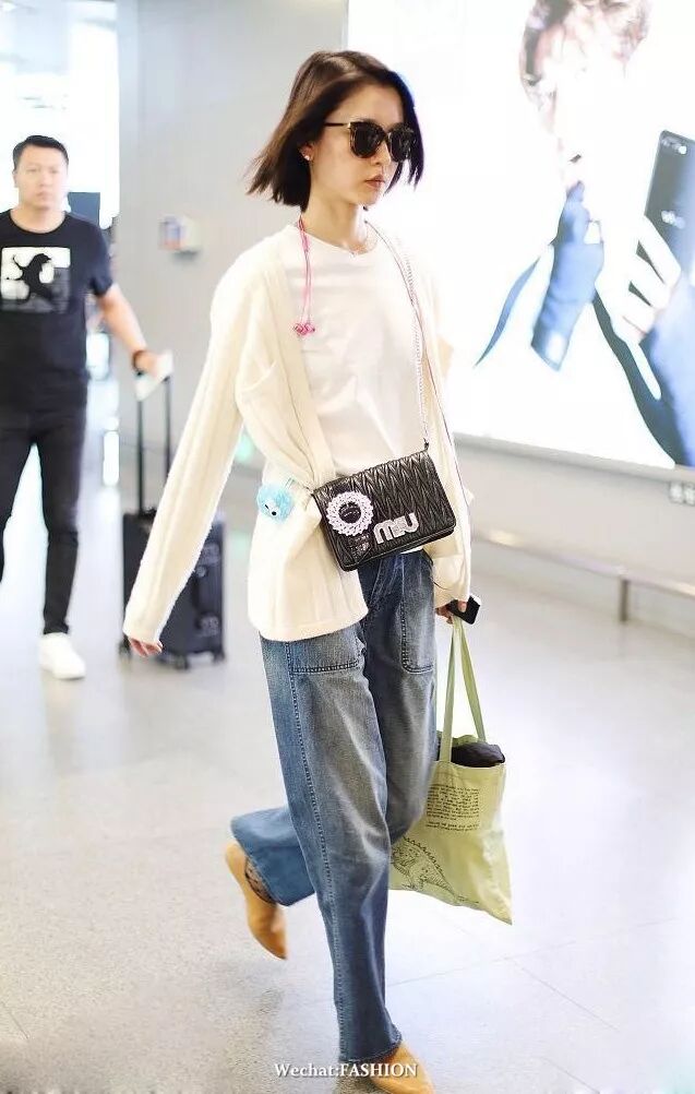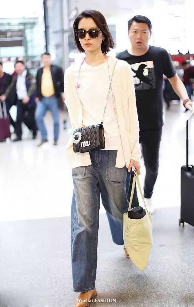 杜鹃难得有机场街拍,白色针织开衫搭配阔腿牛仔裤,斜挎Miu Miu单肩包,墨镜来自Gentle Monster,平底鞋来自Acne Studios。画风就跟她的作风一样,甚为低调。没什么烟火气的她,私服风格却很生活化,搭配基础得不得了。
