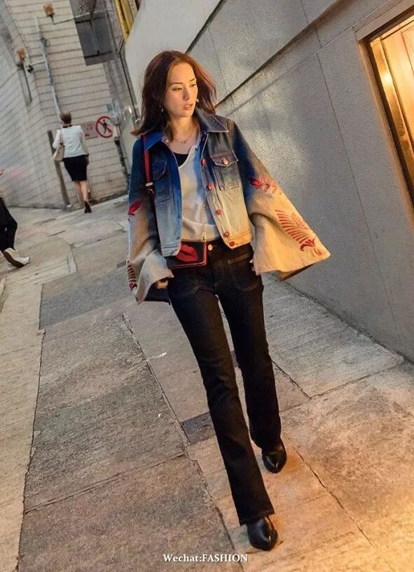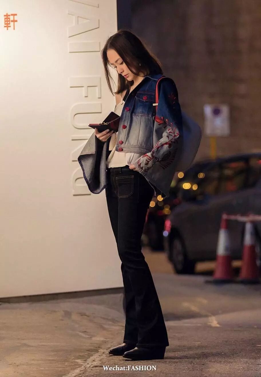 钟欣潼最新香港街拍,身穿KOOKASTYLE古拉良品潮流女装喇叭袖刺绣牛仔外套,MCQ的紧身微喇长裤提升下半身比例,整身造型时髦显身材。手拎GUCCI涂鸦腰包,慵懒随性。