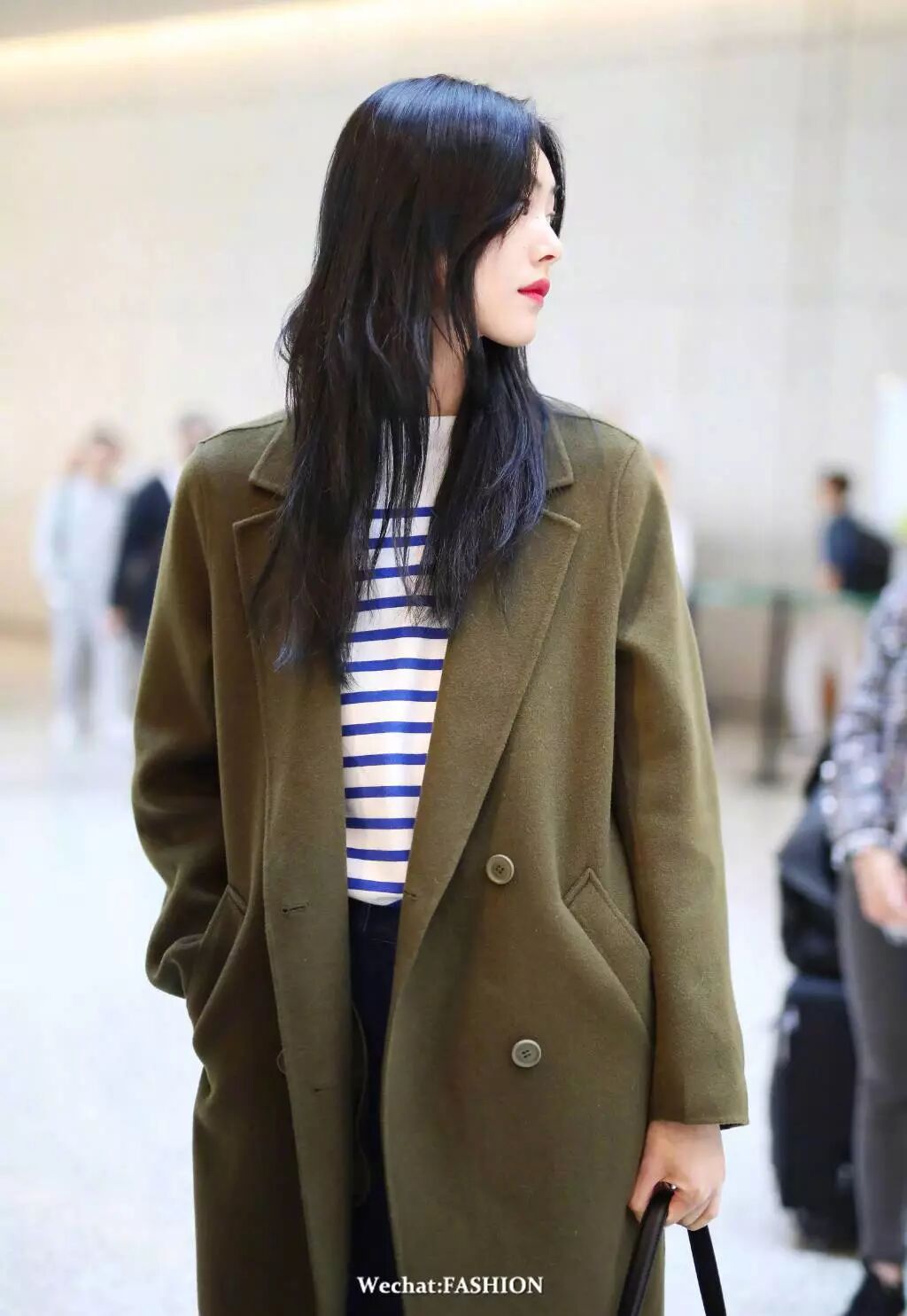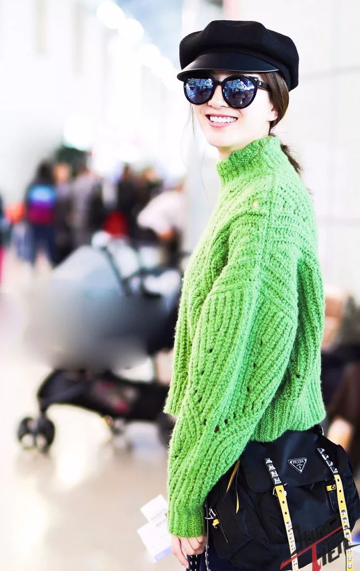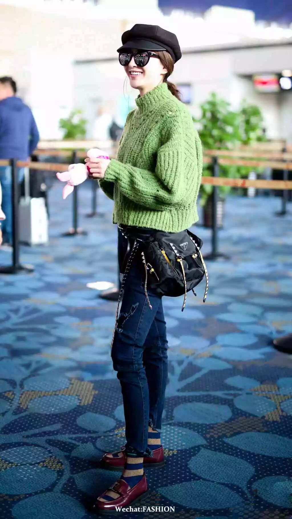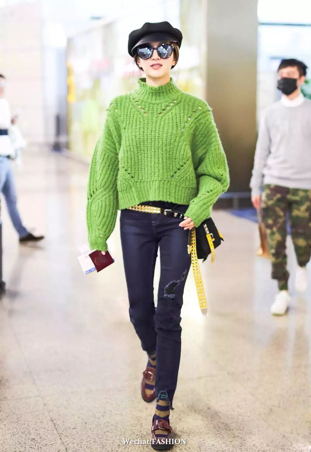 江疏影身穿ISABEL MARANT短款绿色毛衣,下穿lee最新优型单宁系列牛仔裤,搭配Fendi 连袜短靴现身上海机场。Prada包包别致背法时髦有型。这个绿毛衣真不是谁都能驾驭的!