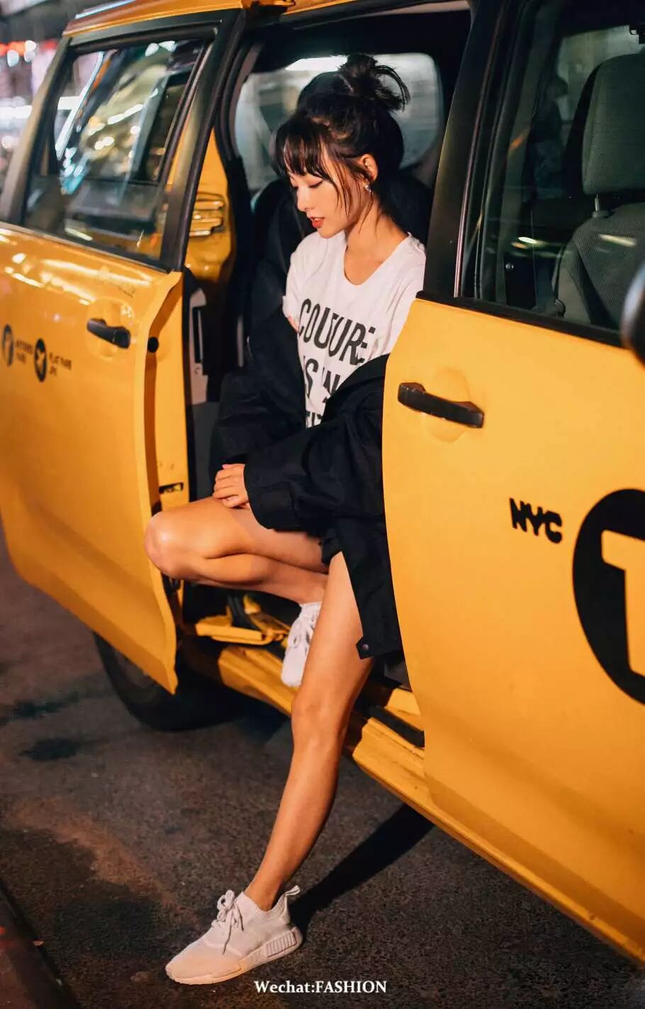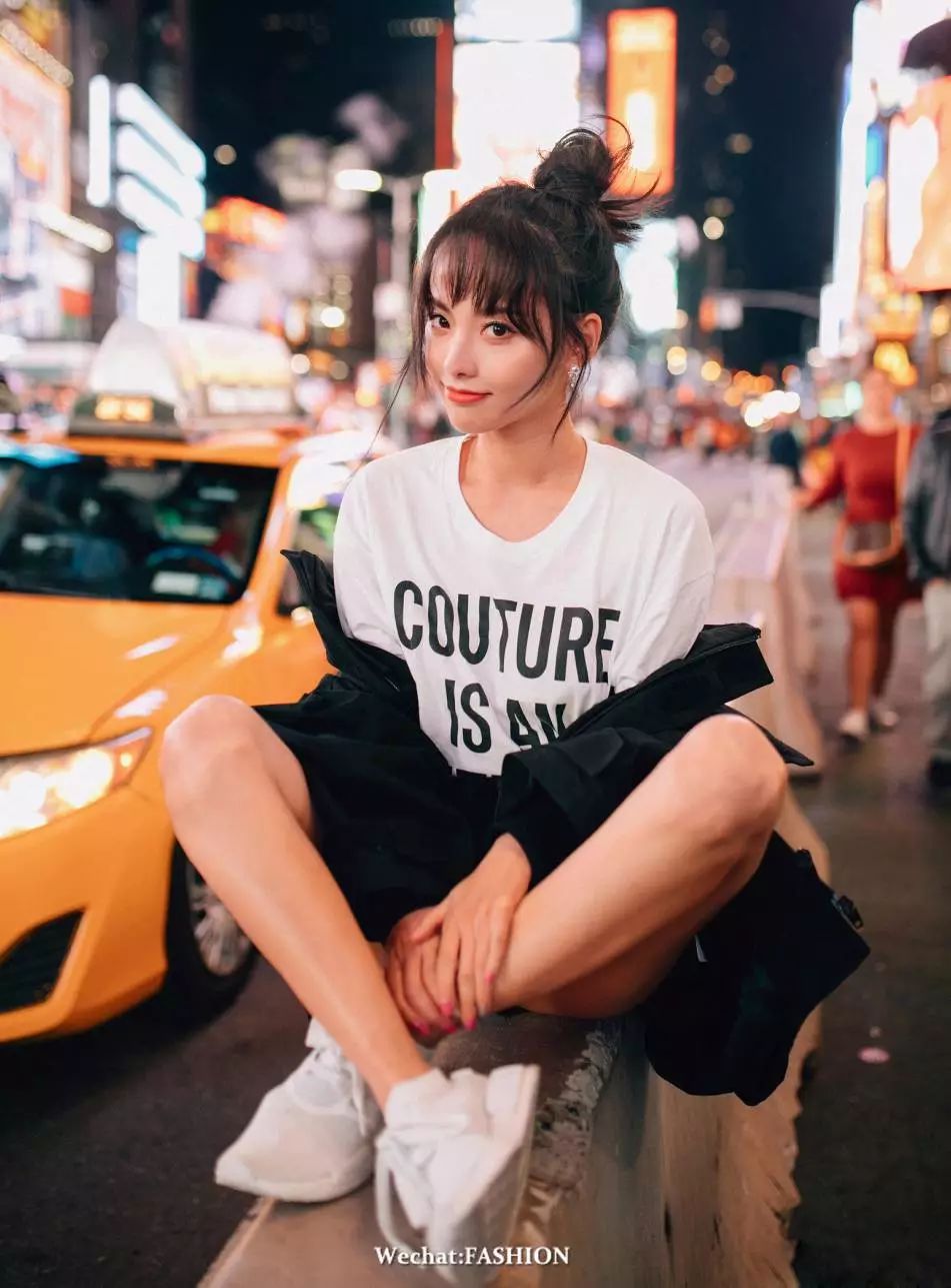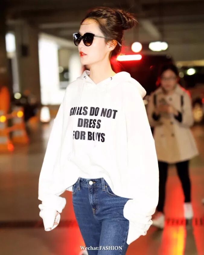 张嘉倪身穿Balenciaga 2017秋冬系列男款夹克,搭配MOSCHINO白色T恤和Adidas NMD运动鞋,丸子头,超短裤!