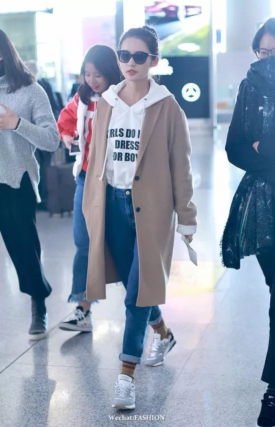 李沁用Slogan卫衣配卷边牛仔裤,沁菇凉的装扮时髦又舒适~ 外搭一件驼色及膝大衣,简洁的造型更显清爽年轻。