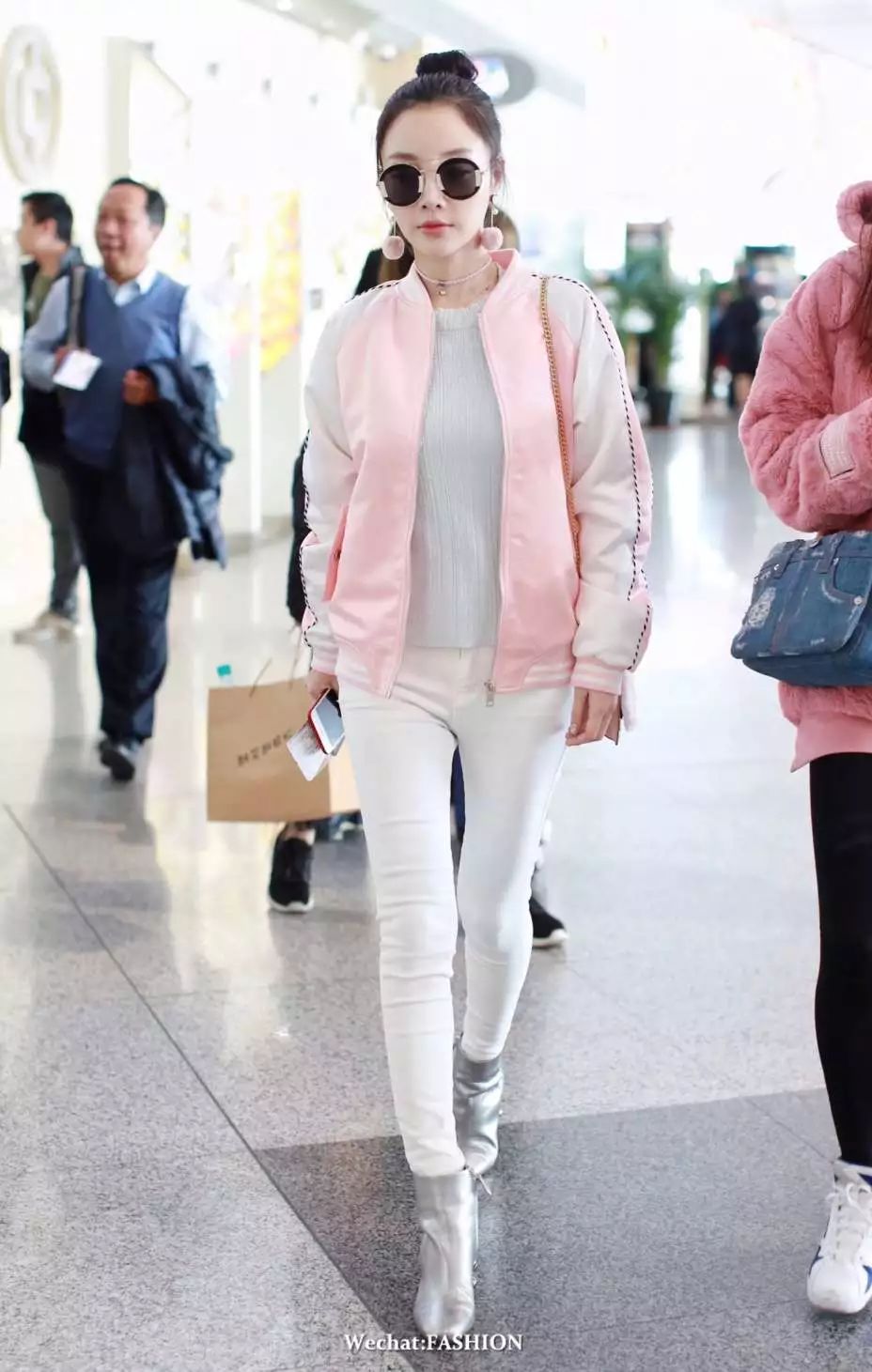 李小璐现身北京机场,身穿Jacqueline Lulu粉色夹克,肩背Miu Miu单肩包,脚踩Miu Miu短靴,颜色搭配很有少女心。