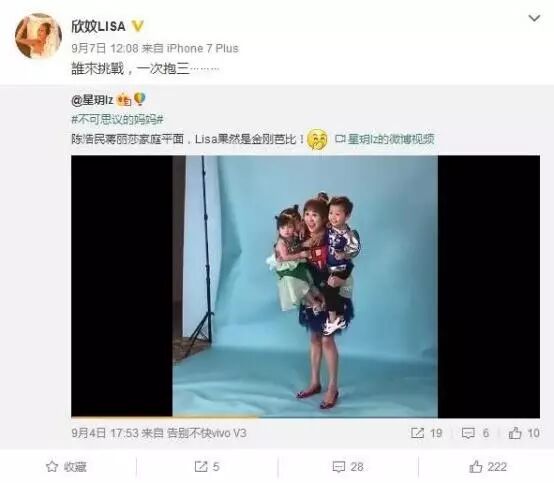 9月7日,有网友在微博上晒出陈浩民妻子抱着三个孩子拍照的小视频,并写道:“陈浩民蒋丽莎家庭平面,Lisa果然是金刚芭比!”