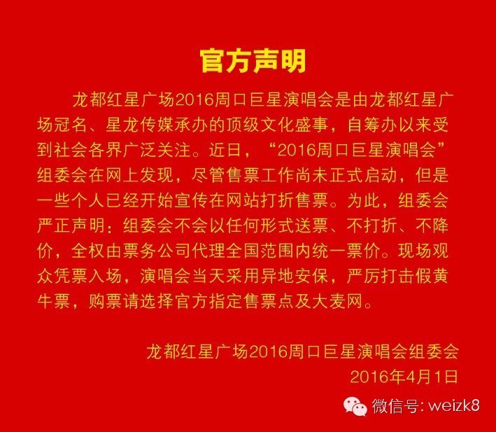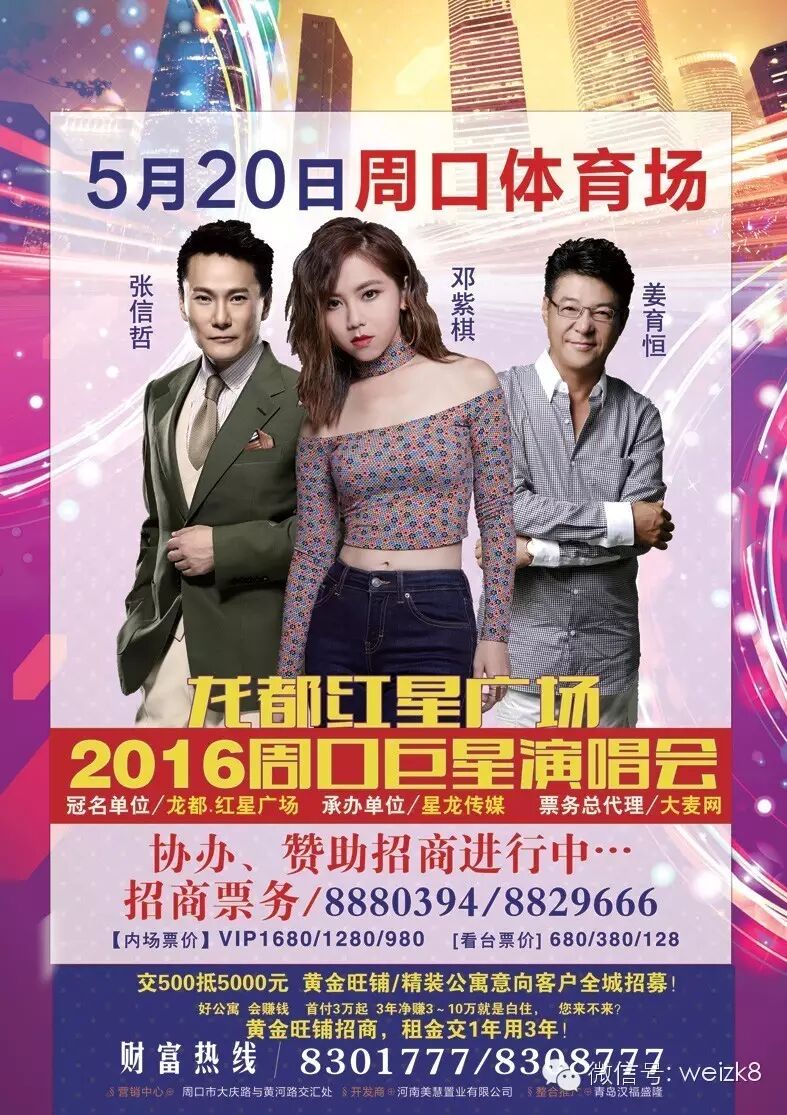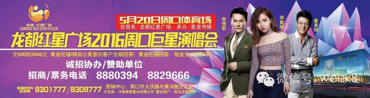 2016年5月20日晚8点由龙都.红星广场冠名、星龙传媒承办的“星耀龙都唱响周口”2016周口巨星演唱会强势来袭,震撼唱响。