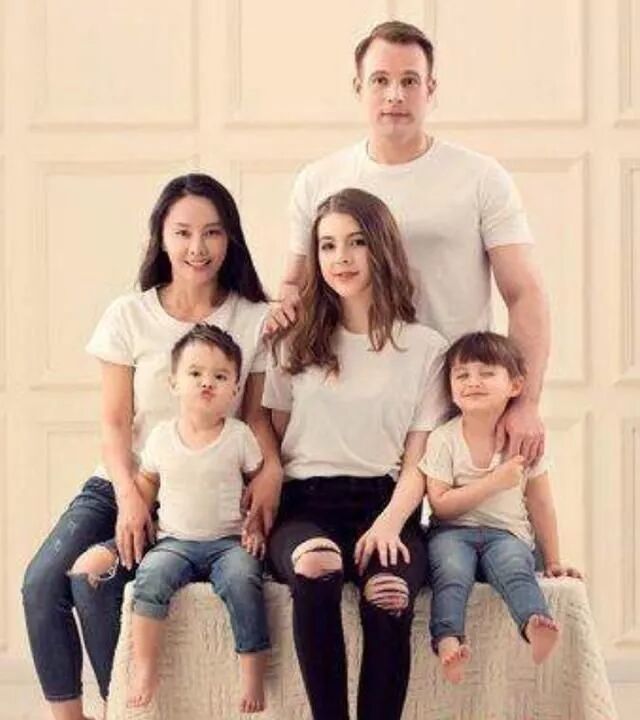 马雅舒和外国老公生育了一女一儿,大女儿看起来很懂事,一看也是混血儿出生,小女儿长得可爱,小儿子长得帅气,这个头发颜色统一,一看就是一家子么?哈哈!