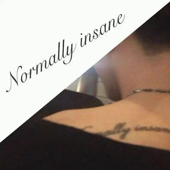 肩膀后面是他的座右铭“Normally insane”——不疯魔,不成活。表示即使成长过程饱受风雨精神快崩溃,但仍要有强大的内心和意志力。