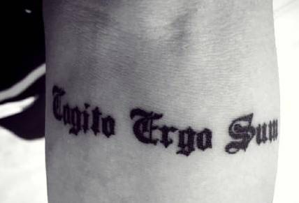 但,人家的纹身可是文艺着呐!这串看不明白的拉丁文,小鹿还在微博上“显摆”来着。大神翻译过来的说法是“我思故我在”。