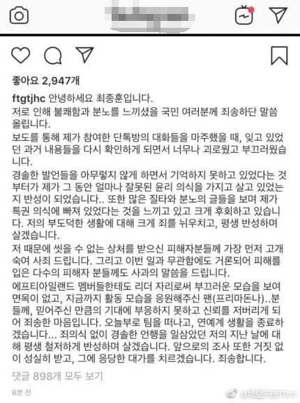 今晚,崔钟训在ins发文道歉,表示让国民感到的不快和愤怒 为此向大家道歉。
