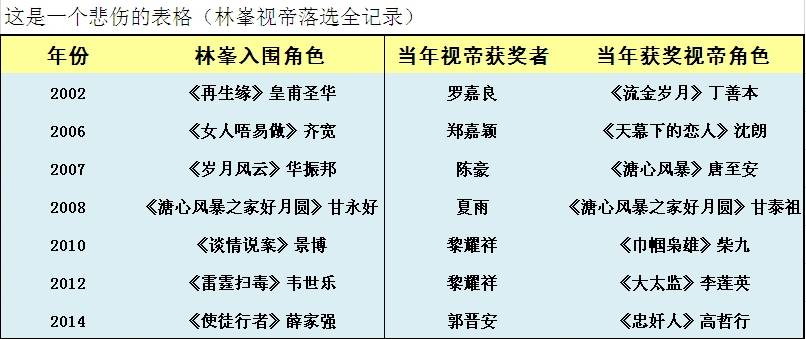 可后来,林峯的演技一年比一年纯熟,受欢迎程度也有赶超几位前辈的趋势,但遗憾的是,在视帝的路上每年陪跑,无一例外。