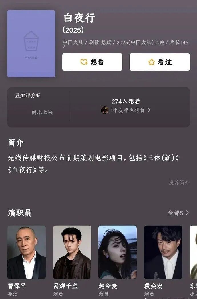 内容是东野圭吾的《白夜行》国产版豆瓣页面更新了班底,导演曹保平,男女主角分别是易烊千玺和赵今麦。