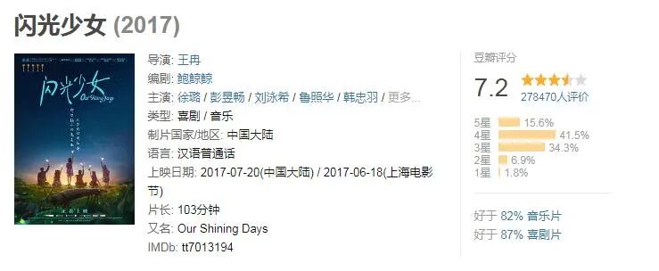 这部二次元音乐题材的电影,虽然上映时票房不如人意,一个亿都没有,但后来线上播映的口碑不错,国产青春片里少有的豆瓣评分7分+的电影。