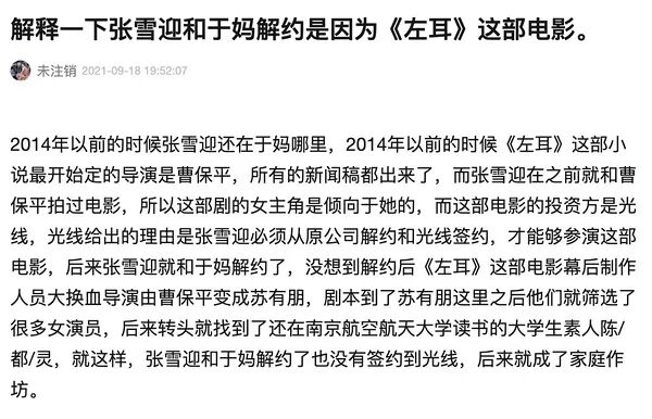 比她更倒霉一点的是张雪迎,《左耳》早期对外宣传是由曹保平导演,张雪迎和曹保平合作过《狗十三》,成为女主李珥人选原本顺理成章,但后来曹退出项目,张雪迎也消失在演员名单里。