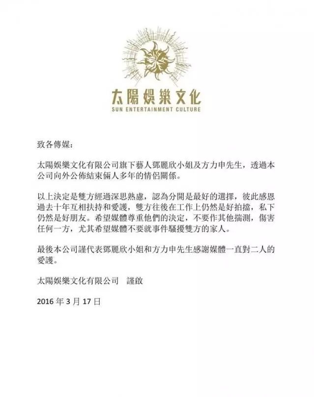 今天(3月17日),方力申及邓丽欣(Stephy)经纪公司发文对外公布两人分手的消息。并表示,这是双方深思熟虑后的选择,彼此感恩过去10年互相扶持和爱护,今后双方仍是好朋友。