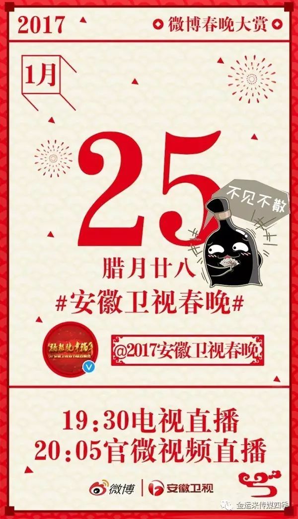 为营造春晚氛围,更好的让观众了解徽晚的进展,安徽卫视春晚官微、安徽卫视官方微博、安徽卫视剧乐部微博等纷纷发布2017安徽春晚倒计时海报,海报上独家冠名中国老八大名酒古井贡酒·年份原浆的LOGO醒目。