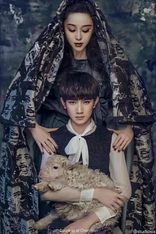 看着很普通,就是精修影楼风对不对?但是请注意,摄影师以圣母与圣子为概念,特别为范冰冰和王源拍了一张合照,是酱紫的