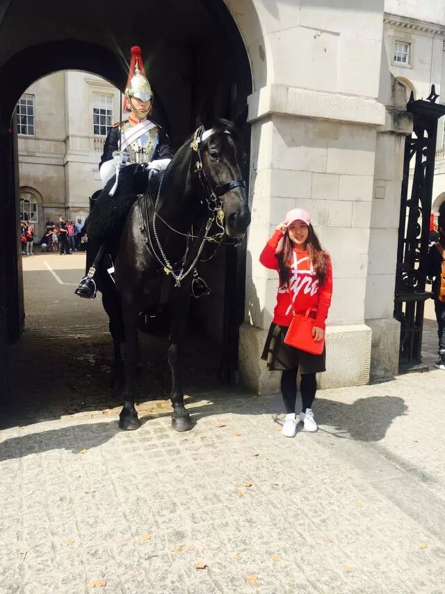 这里聚集着五湖四海的游客(像我们就是,笑),这是语言、文化交杂的聚集所。在白金汉宫周围站着那些戴高高地黑色绒帽的士兵,一动不动,高昂着头,大红色上衣配黑裤,擦拭得油亮油亮的皮鞋泛着光,正值士兵轮换岗位,场面也十分引人注目,这一天的中午,感觉格外的热,看着他们的帽子和穿着有些担心他们是否会中暑。再往前走,就是骑兵营,门口有一身端庄打扮的皇家禁卫军骑在毛色光亮的马匹上,也惹得路人驻足围观观看。