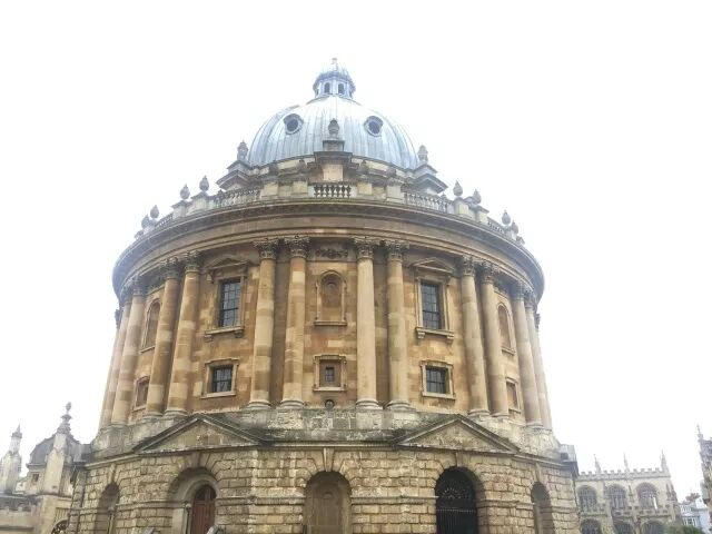 在参观的所有的大学中,印象深的当属牛津了,当我们庞大的客车略微有些笨拙地驶入牛津的街道,古朴的欧式建筑代替了公路边繁茂的树林,哥特式及巴洛克式的教堂接连不断,街道上的行人也越加多了起来。下车便是期待已久的地方,映入眼帘的便是紧密相连的老式排屋,黄褐的石墙上镌刻着岁月侵蚀的痕迹。在老师和导游的带领下我们正式开始了牛津学院的旅程。熙熙攘攘牛津街道,散发着沉重的历史气息, 好像这里的一砖一瓦都在向人们诉说它们所经历的故事,绿油油的草坪,问了才知道这里是爱丽丝的拍摄地,大概在某个晴朗的午后,刘易斯·卡罗尔也是倚坐在这片草坪上,幻想出了《爱丽丝梦游仙境》的情节吧。我的确深爱牛津城的和谐气氛,哪怕只是漫步其中,也能深切地感受到小小街市独有的安祥。望眼尽是土黄与深褐色的古老砖墙交接入眼,人们自觉有序地步行在街道上,稀疏车辆,可谓小城。钟声当当响起时,祭奠那些逝去的伟人,牛津更像一位使者,悄无声息地记录下历史上永久的一刻。