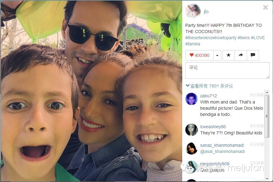 《美国偶像》评委、歌手Jennifer Lopez昨日与前夫Marc Anthony一起为他们的龙凤胎孩子Max和Emme庆祝生日,45岁的J-Lo在Instagram发布了四人温馨合照,并配文称"派对时间!!! 祝小家伙们7岁生日快乐!!"女儿Emme(图右)犹如翻版J-Lo,漂亮可爱,而儿子Max(图左)则做起了鬼脸。