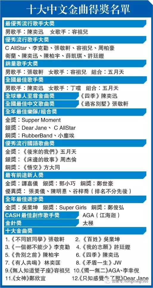 乐坛第3张成绩表昨晚由港台《第39届十大中文金曲颁奖礼》颁出,全晚颁出共51个奖项,出现12首金曲,陈奕迅与容祖儿到颁奖礼尾声才压轴现身,尽显天王天后地位。陈奕迅第12度夺“最优秀流行男歌手大奖”及凭《四季》获“全球华人至尊金曲奖”等连夺5奖成为大赢家,容祖儿13度蝉联“最优秀流行女歌手”,与张敬轩一样夺4奖,两人均在唱片销量中称霸。