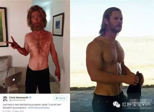 2015年11月,"雷神"克里斯·海姆斯沃斯在社交网站分享了一张他蓬头垢面、身材精瘦的照片,颠覆了他标志性的壮汉形象。