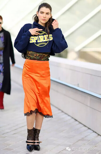 在来我们要说说女生最关心的,那就是如何将太过男性化的帽衫穿出女人味。首先就是,帽衫+飘逸裙装,用雪纺火镂空等女人味的细节来与随性休闲的帽衫做反差搭配,完美融合。