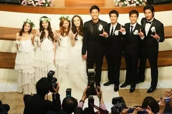 而在婚宴上,白色礼服配黑底花色领结,很好地和服务生区别开。