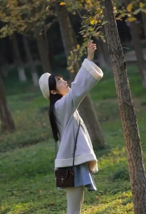 天气渐渐转寒,照片中的徐娇穿着毛绒绒的外套和同套帽子,站在林间,伸出右手,似乎是想碰触到树上的银杏叶子。整张照片营造了一种温暖而静谧的氛围,让人看了心情放松。