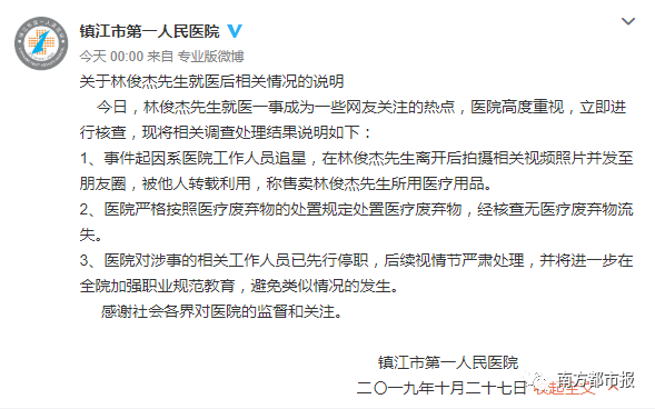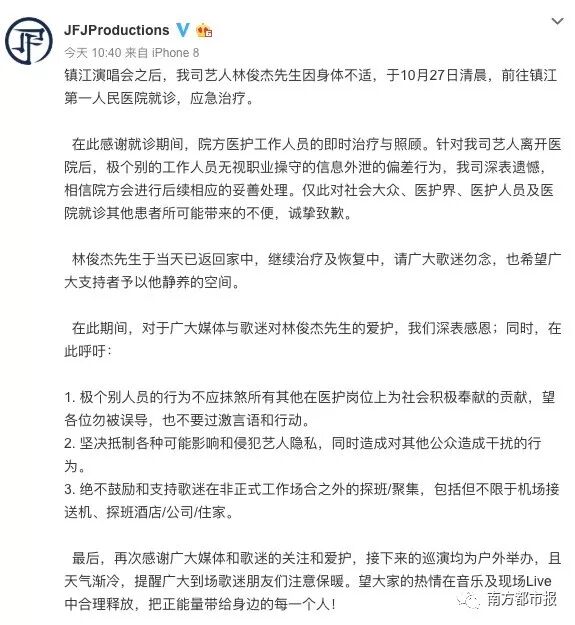 镇江演唱会之后,我司艺人林俊杰先生因身体不适,于10月27日清晨,前往镇江第一人民医院就诊,应急治疗。 在此感谢就诊期间,院方医护工作人员的即时治疗与照顾。针对我司艺人离开医院后,极个别的工作人员无视职业操守的信息外泄的偏差行为,我司深表遗憾,相信院方会进行后续相应的妥善处理。仅此对社会大众、医护界、医护人员及医院就诊其他患者所可能带来的不便,诚挚致歉。