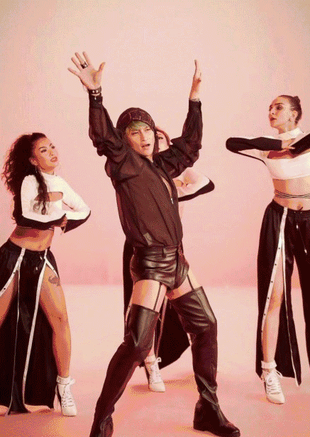 他画着妖艳的眼影和中毒色口红,脚踩恨天高,彩虹发色、紧身裤、蕾丝装、塑料袋等各种大胆元素轮番上阵,MV也放弃保守风格,明艳的背景,配合妖娆的男女演员舞蹈和牛奶浴、波波池戏份,充满夸张挑逗的意味。