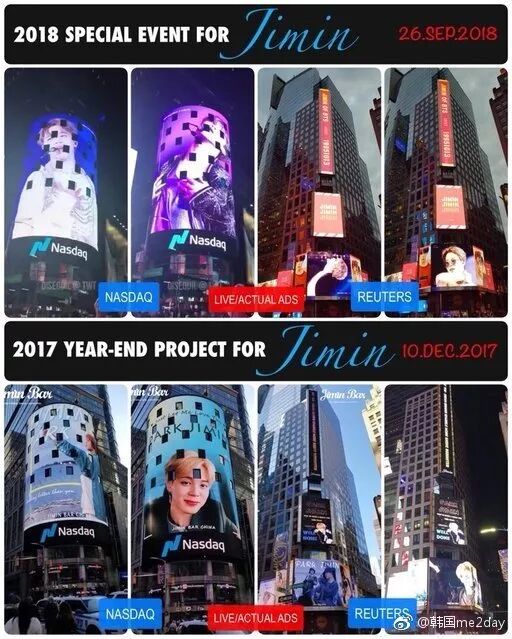 据悉,纽约时代广场的纳斯达克和汤姆逊电光板被称为“世界的交叉路”,一天平均流动人口达到150万。JIMINBAR CHINA曾为迎接朴智旻的24岁生日在中国,荷兰,日本,英国,中国台湾等地进行了18项广告活动,达成历代级的生日祝贺规模。此外,JIMINBAR CHINA在防弹少年团出演《Good Morning America》时,于时代广场的12块大屏幕上投放了朴智旻的个人广告。