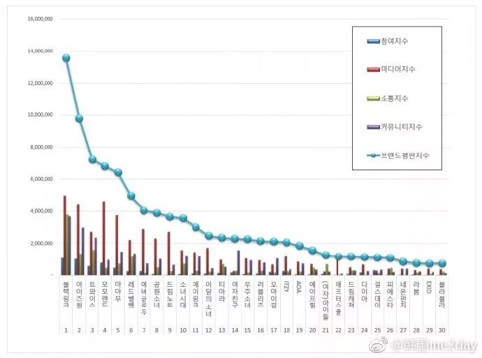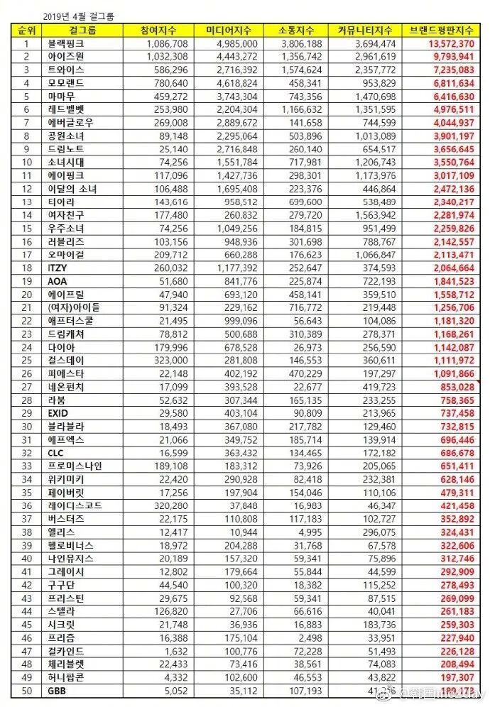 14日,根据韩国企业评判研究所公开的最新数据,对2019年3月12日至2019年4月13日期间的女团品牌评价大数据进行分析,其中BLACKPINK以13,572,370的品牌评价指数获得1位。同时2-5位分别为IZ*ONE,TWICE,MOMOLAND,MAMAMOO。