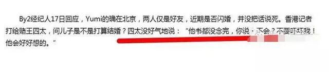 but!这幸福的画面很快就被何猷君的妈妈给撕开了!这边结婚的消息刚出来,赌王的四太太,何猷君的妈妈就立马站出来彻底否认,说自己儿子书都没念完,不会结婚,还撂下一句“他会好好想想的”。