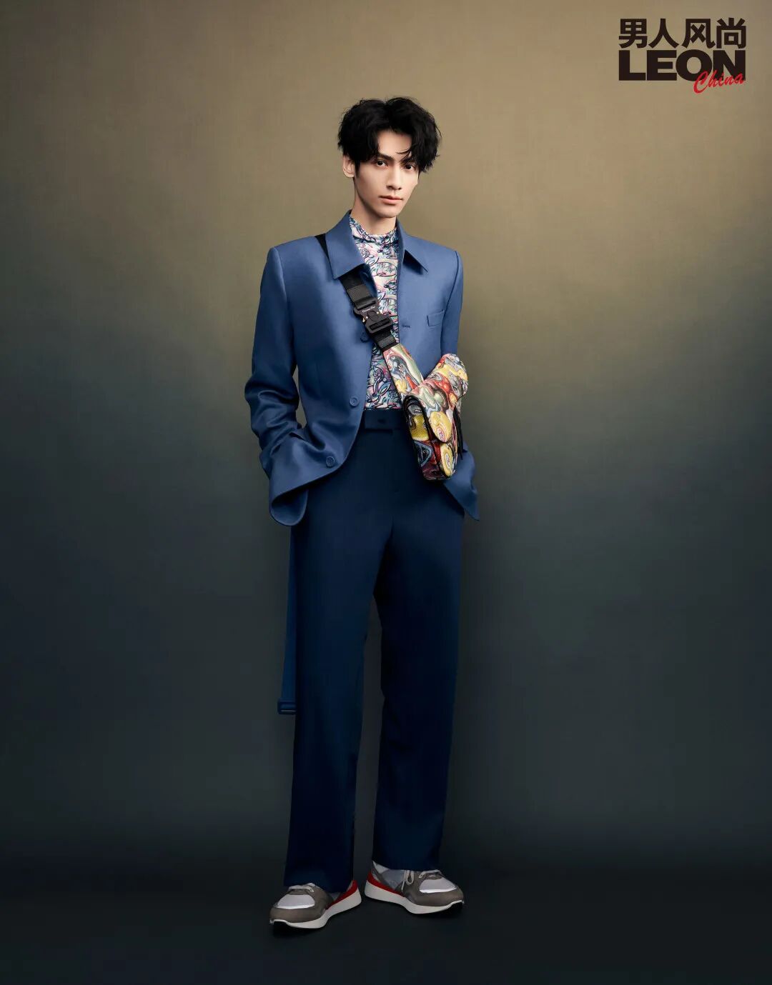 蓝色羊毛夹克、生肖高领丝质长袖、羊毛长裤、运动鞋、中号彩色提花马鞍包 / 均为迪奥二零二一秋季男装系列