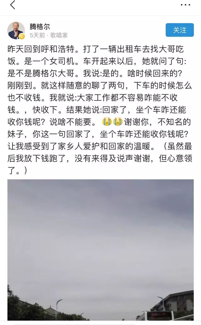 7月27日,著名歌唱家腾格尔在网络上分享的一个自己在呼和浩特市打车的小插曲引发了广大网友的关注和讨论。截至8月1日14时,已经有了2500多万的阅读量,得到了将近7万个赞。