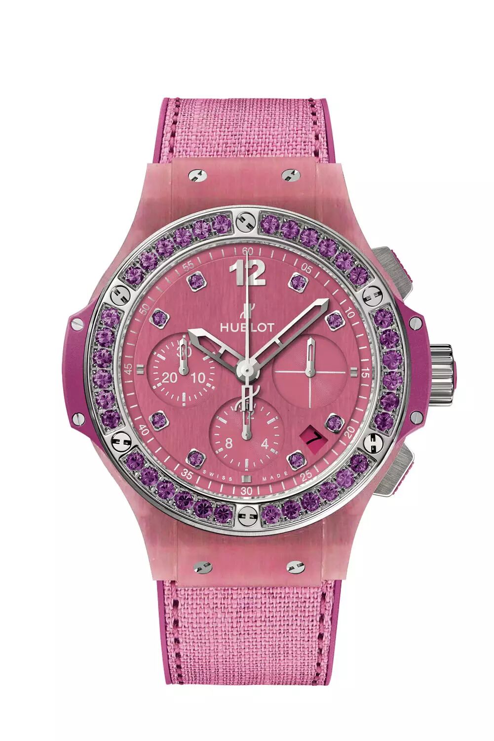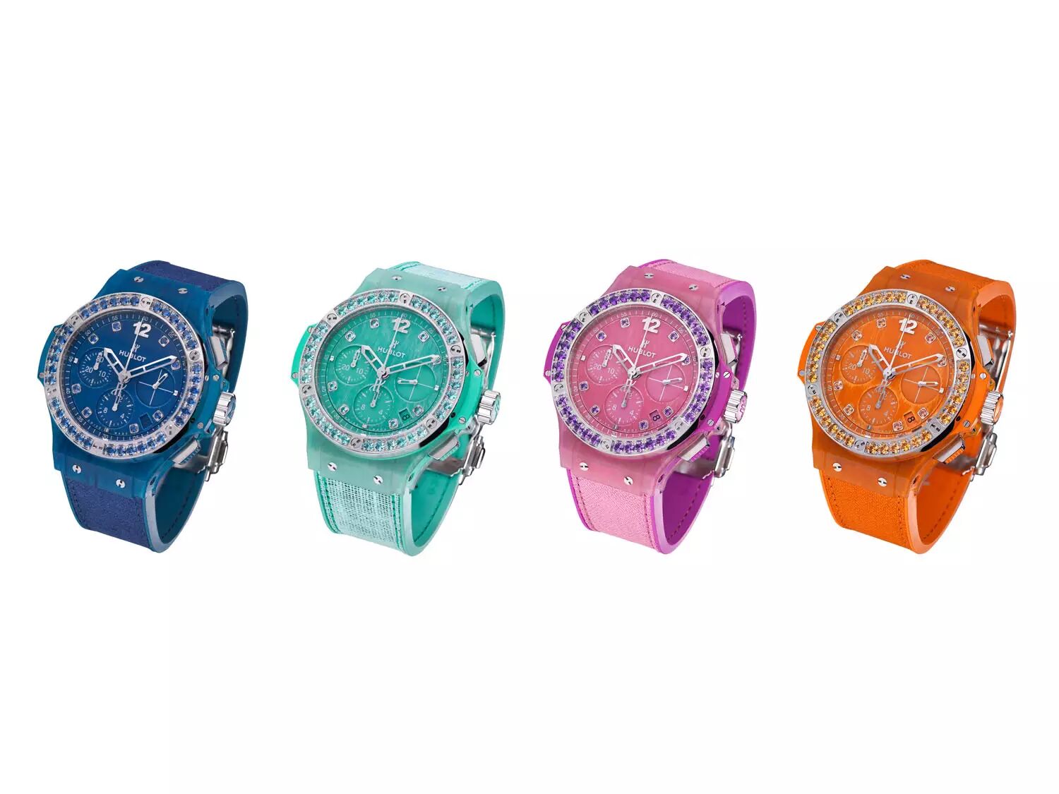 这一光芒四射的腕表系列有4种绚丽色彩可供选择——海蓝色、冰蓝色、紫红色和明橙色,每款限量200枚。色彩极具吸引力,令人垂涎欲滴。Big Bang水果亚麻腕表可完美搭配任何风格,其使用的亚麻运用天然色素进行着色。蓝色或橙色蓝宝石、黄宝石和紫水晶点缀着表圈和表盘,41毫米直径的表壳中配备HUB4300自动上链机械计时机芯。从融合了亚麻材质的橡胶表带,到带透光复合材料保护的亚麻表壳,亚麻表盘和复合树脂镶件,该腕表完美将单色亚麻织物演变为腕间时尚单品。仔细协调色调的对称运用,这种技艺很难掌握,因为颜色会因染料的渗透而变化。需要花费数月时间进行研究和开发,以匹配该材料和色调,进而打造完美结合。