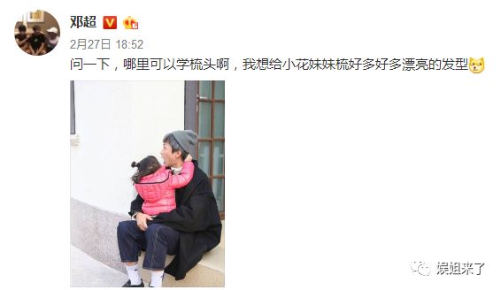 2月27日,邓超发微博说好想学习怎么梳头发,因为想给女儿亲自梳很多漂亮的发型!看看这老父亲多不容易,为了女儿都要化身Tony老师了。仔细看看小公主的发型,这应该就是邓老师的杰作吧,心疼小花。网友们喊话:邓超你可拉倒吧,不要对亲闺女这样!