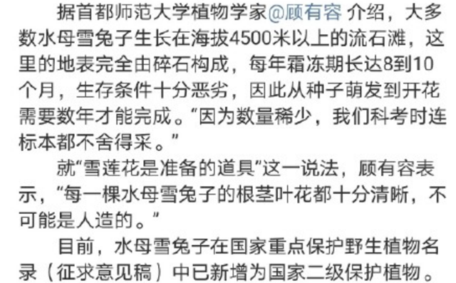 但有植物学家表示,节目里的雪莲花,根茎叶花都非常清晰,不可能是人造的。