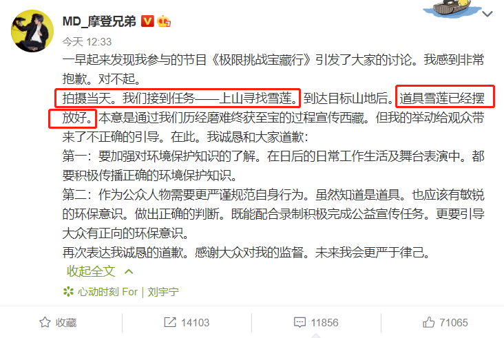 但是究竟雪莲花是否为道具,引发大家采雪莲这样的不合适行为的节目组还未正面回应。