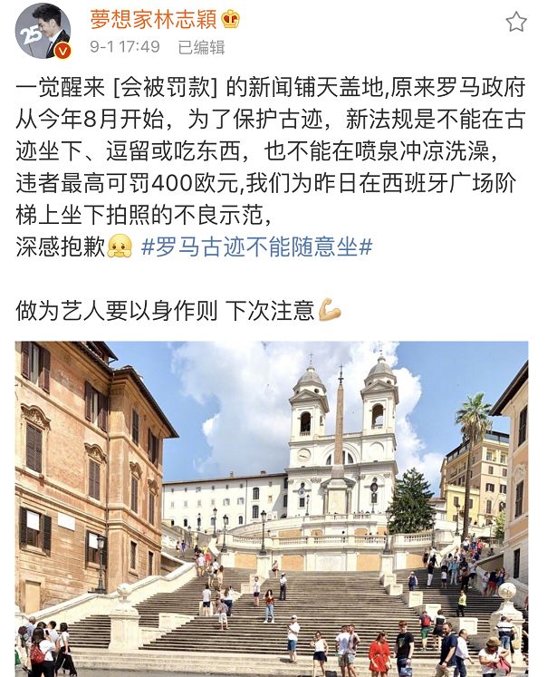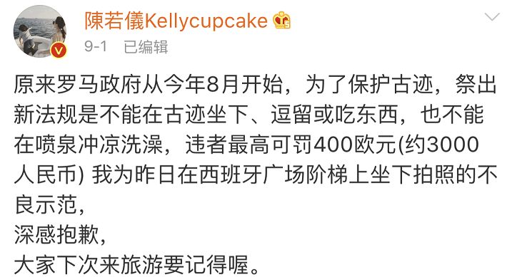9月1日下午时分,陈若仪发文称,她为在西班牙广场阶梯坐下拍照深感抱歉,并提醒大家下次来旅游要记得。