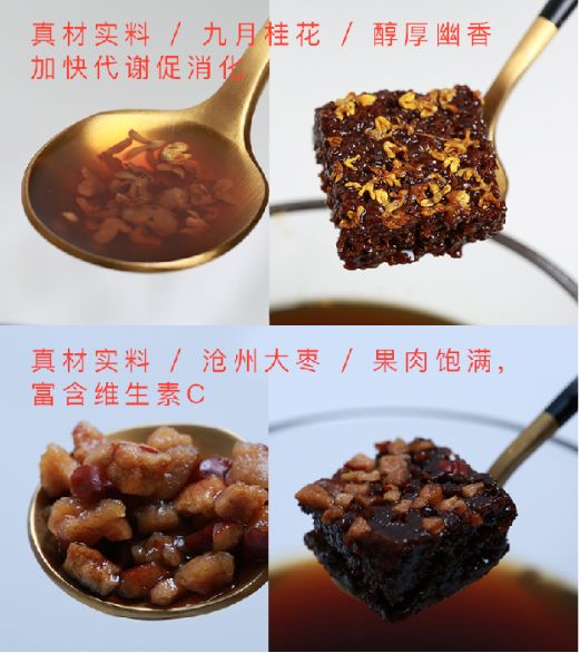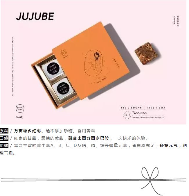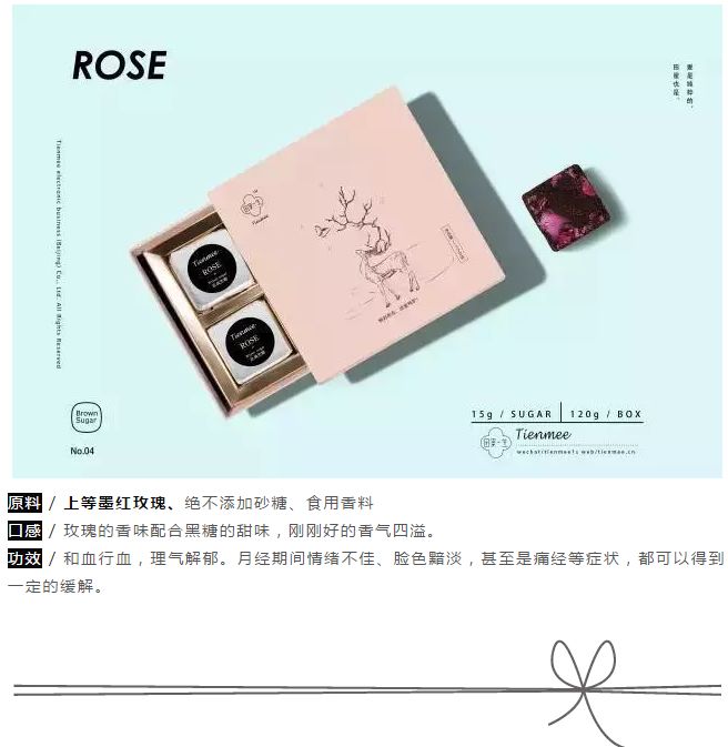 “田蜜一生”的黑糖系列中,包含多种元素,红枣、生姜、玫瑰、桂花,每一种对女性而言,都是极佳的滋补良品,更不用说黑糖本身所带有的绝佳药性。